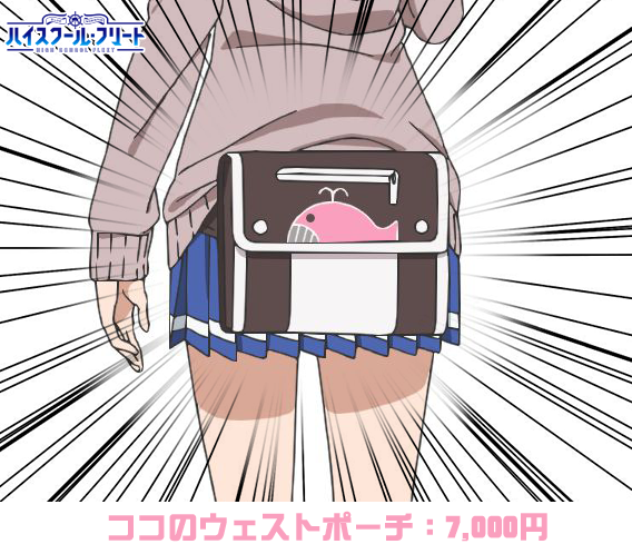 ブースNo.304「ハイスクール・フリート」ブースでは、ココのウェストポーチ7000円、アニメ描き下ろしB2ダブルスエードタペストリー3000円、あっと先生描き下ろし麻侖アクリルボード5000円の3つの商品を販売致します。
